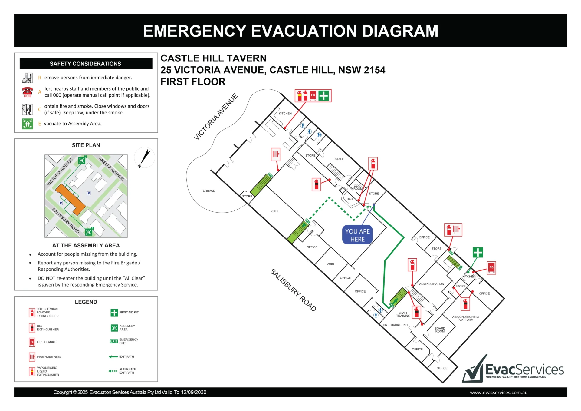 During this assessment, we identify all emergency life safety systems, including fire detection, alarm and suppression systems, exits, and assembly areas. Once the inspection is complete, our in-house evacuation diagram designers create compliant, easy-to-read diagrams that meet all requirements of AS 3745:2010 – Planning for Emergencies in Facilities and, where relevant, state-based legislation such as the Queensland Building Fire Safety Regulations. Your organisation’s branding can be incorporated to maintain a professional and consistent look across your facility.